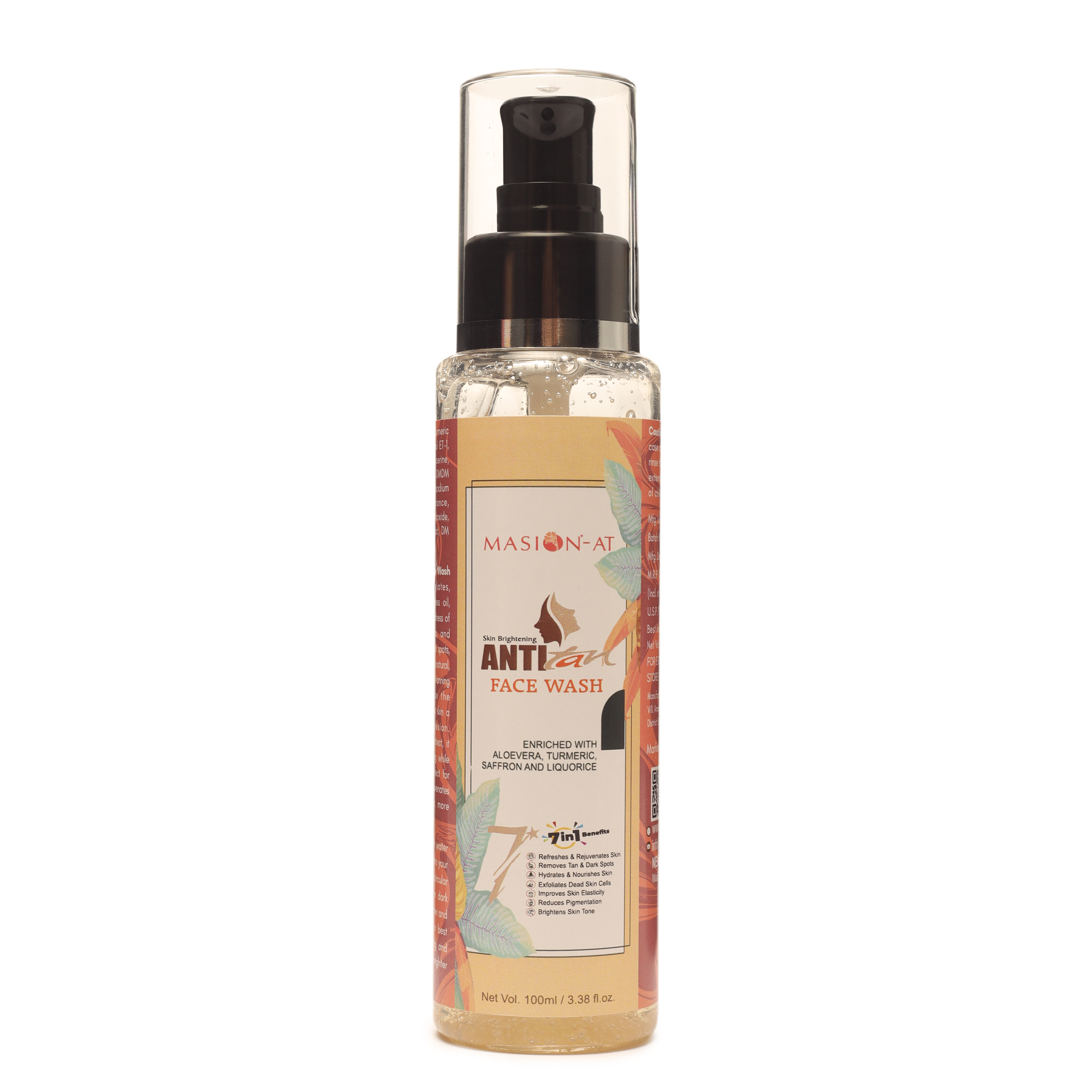 Masion – AT face wash enriched with Alovera ,Saffron Turmeric and Liquorice which gently exfoliate your skin. An instantly refreshing and skin-brightening facewash, Masion Anti-Tan Skin face wash enriched with the goodness of Alovera ,Saffron Turmeric and Liquorice that leaves your skin fresh.Masion – AT face wash brightens, lightens and evens skin tone while keeping the skin soft and hydrated. Accelerates cell renewal to give your skin a youthful glow. When used regularly, the face wash helps restore skin tone by removing hyperpigmentation and promoting a youthful glow.It's a very good product for all skin types even it removes the all dust particles of face skin.