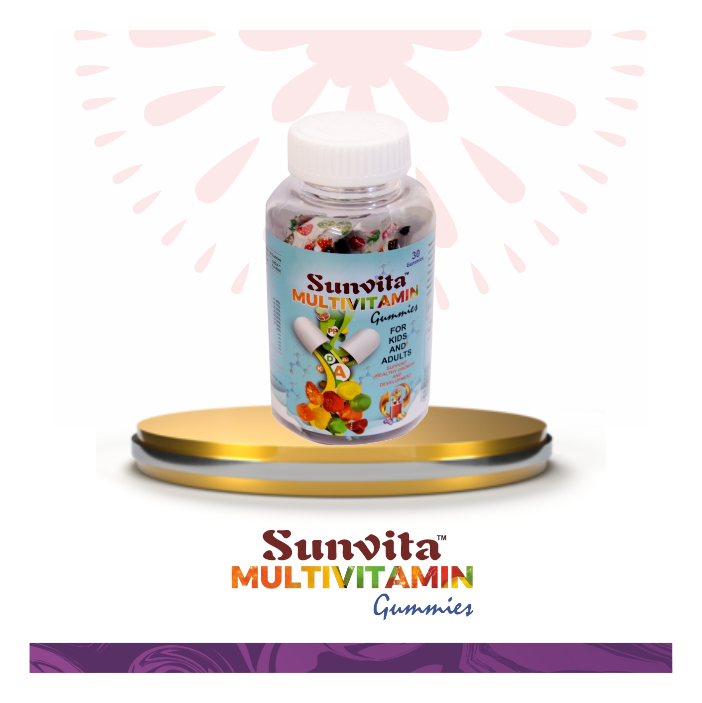 Sunvita multivitamin gummies are soft, pectin-based gummies are fortified with Vitamins A, B5, B12, C, D, and E, as well as Choline, Folic Acid, Iodine, Inositol, Magnesium and Zinc encourage healthy growth and development.